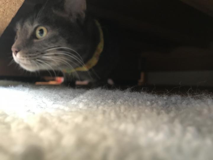 実家に着いて2階の部屋に入れたら早速さくらはベッドの下に隠れ込んだ。やれやれ😔