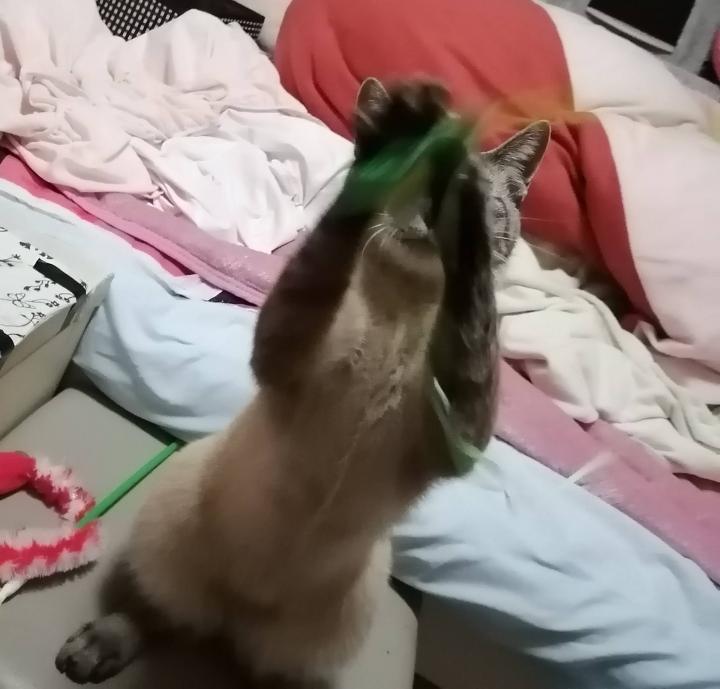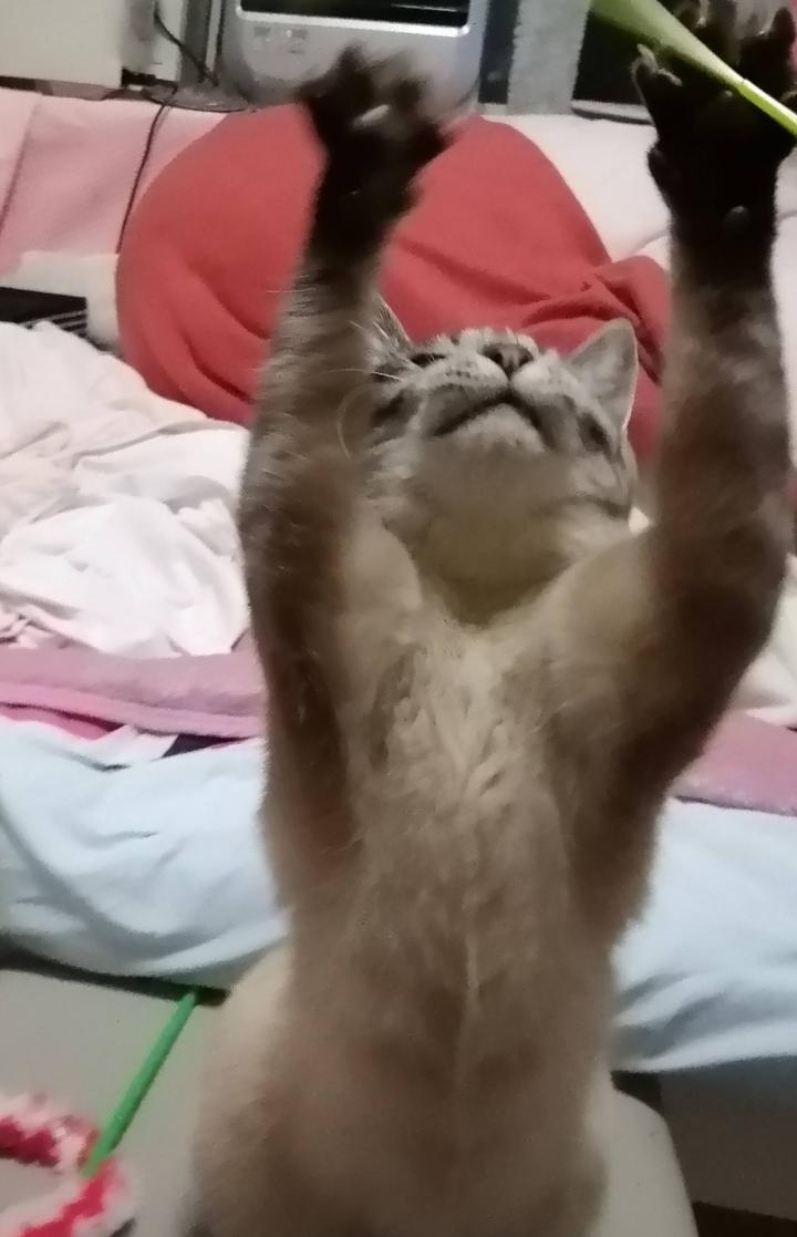なんとかなだめつつ布団の中からちょっとだけじゃらし。