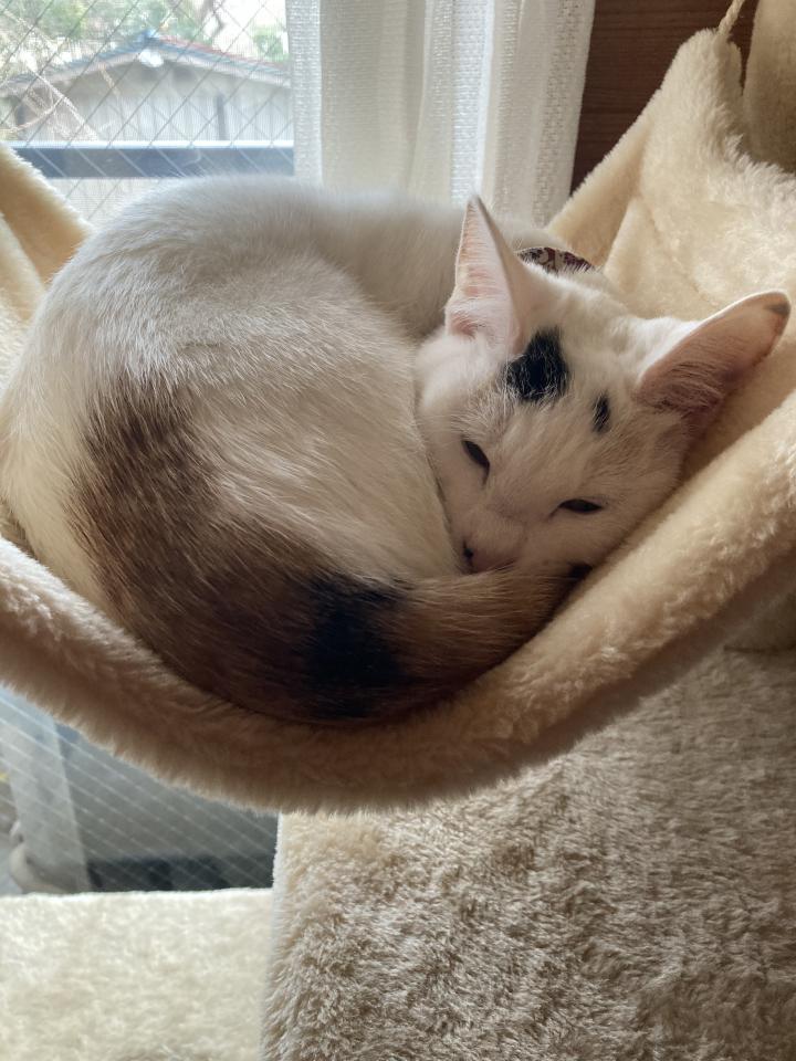 先住ちゃんはお腹いっぱいになると、タワーで丸まって寝てばかり。