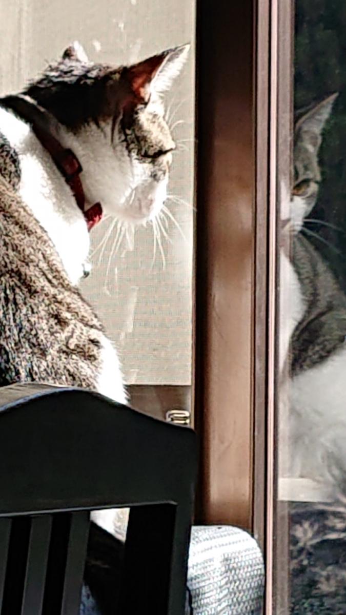 5月15日(木)曇り 今日は天気が悪くなるのだろうか。 少し前まで日がさしていたのだが。 いつものとおり、狭いサッシの隙間から外の様子をうかがうリンちゃんでした。