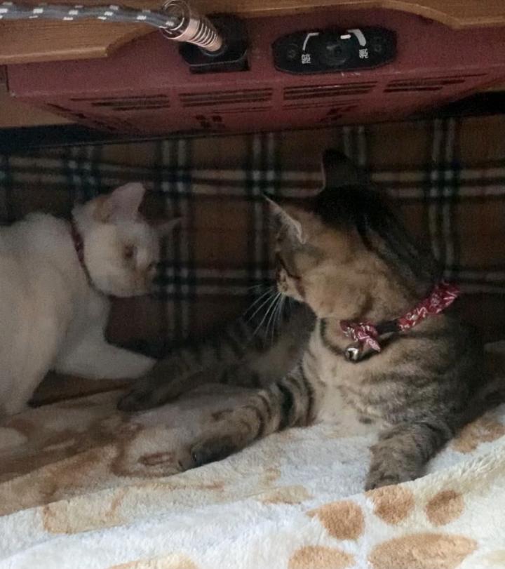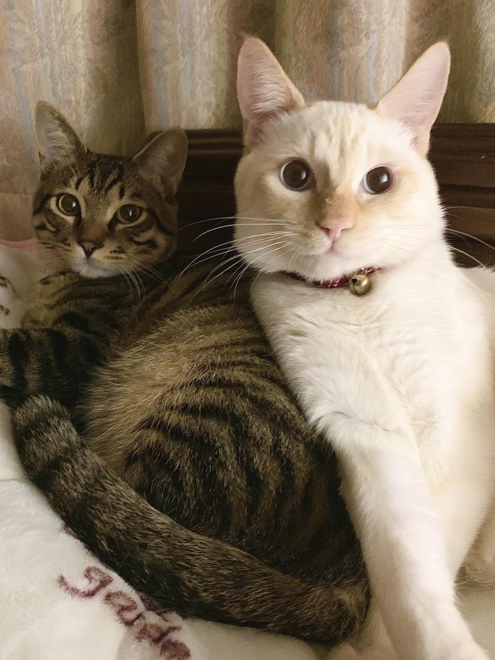 昨日はママの枕で仲良くしてたのに、今は微妙な距離をとって香箱座りしている2人なのでした。