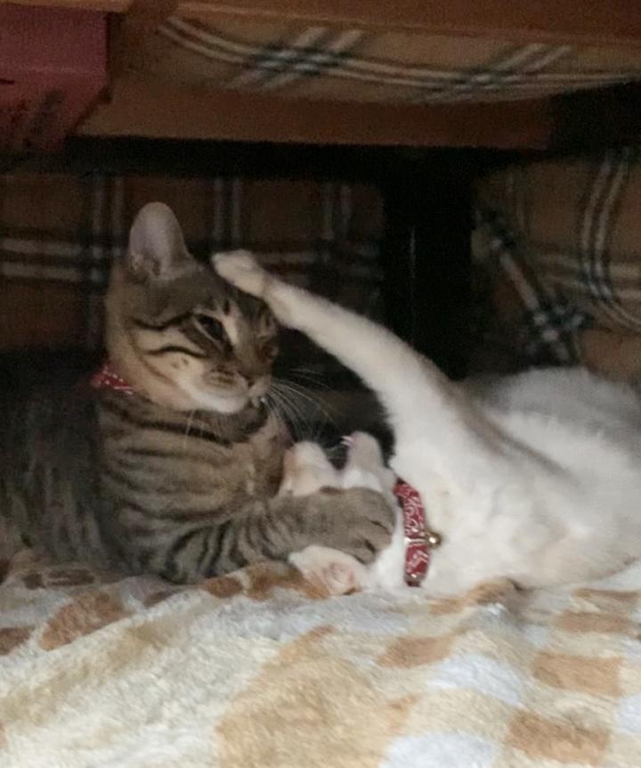 でも、余裕でキジトラ福サンの方が強いので、ママの姿が見えなくなると、そそくさと退散する白猫の富サン(笑)