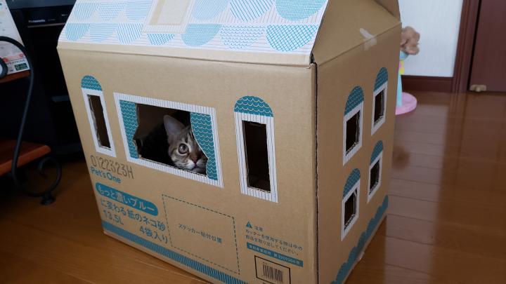 カッターで窓の穴開けて、小萩ちゃんハウス完成〜😸