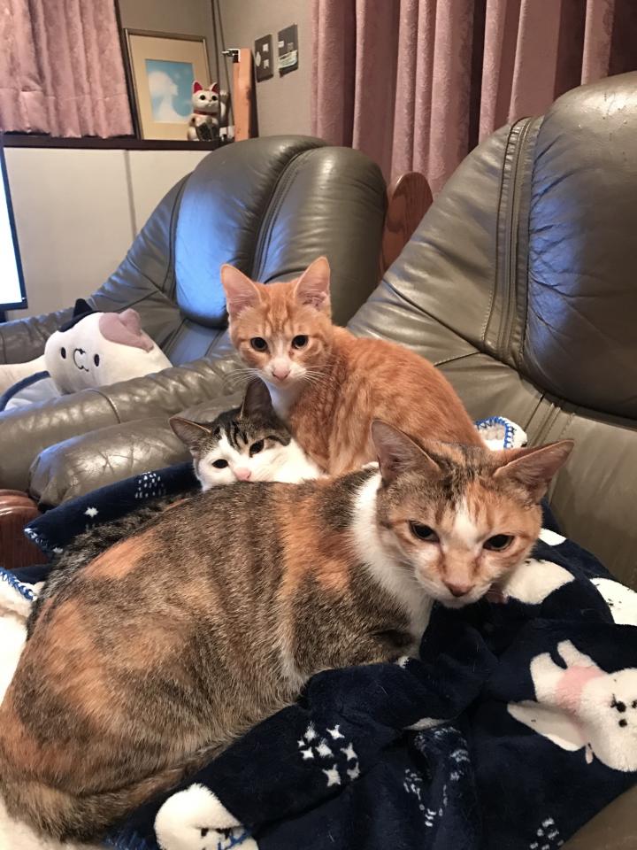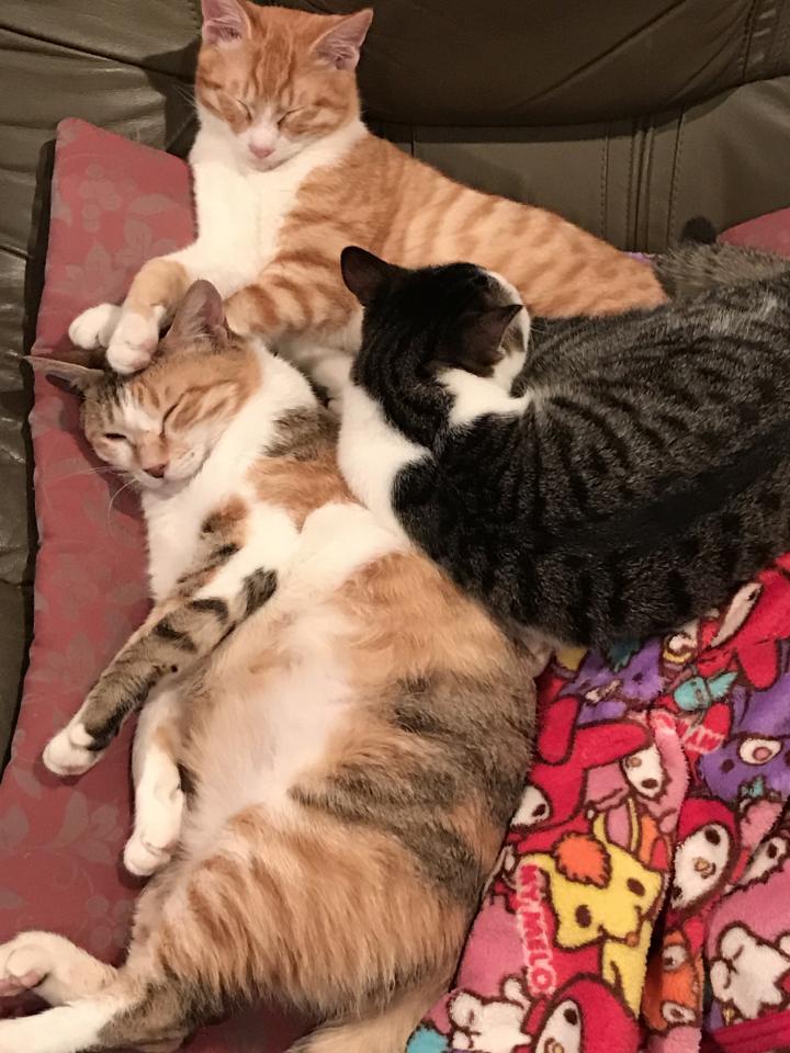 女の子たちはおもちさんに始終寄り添っていました。激しい痙攣があっても、一緒に戦いました。青ちゃんだけは、亡くなる日の夕方におもちさんと鼻をくっつけた時、何かを感じ取った様でそれ以降は遠巻きにおもちさんの周りを回っていましたが…。