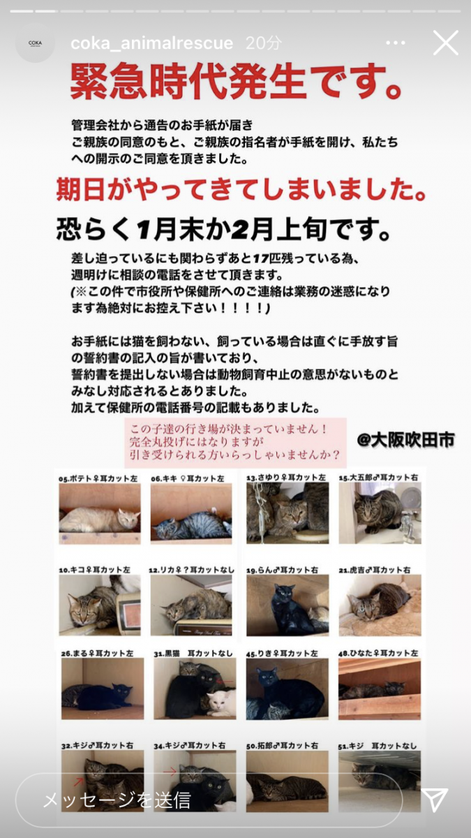 管理会社から連絡あり1月末か2月上旬には猫達は行き場を失い17匹が保健所濃厚だそうです!