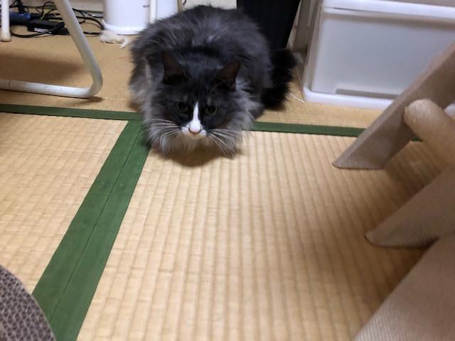 しばらく追いかけっこをして遊んで、めんどくさくなってやめたら、ニャーと催促してきました(リクエストに答えてもう一回だけ追いかけっこ)