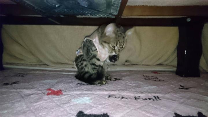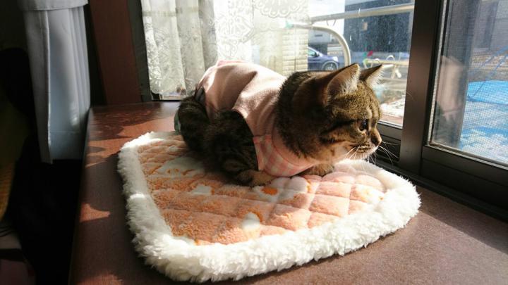家に帰って一度服を脱ぎましたが、まだ傷口をぺろぺろしない方がいいらしく、また直ぐに服を着せられました😿