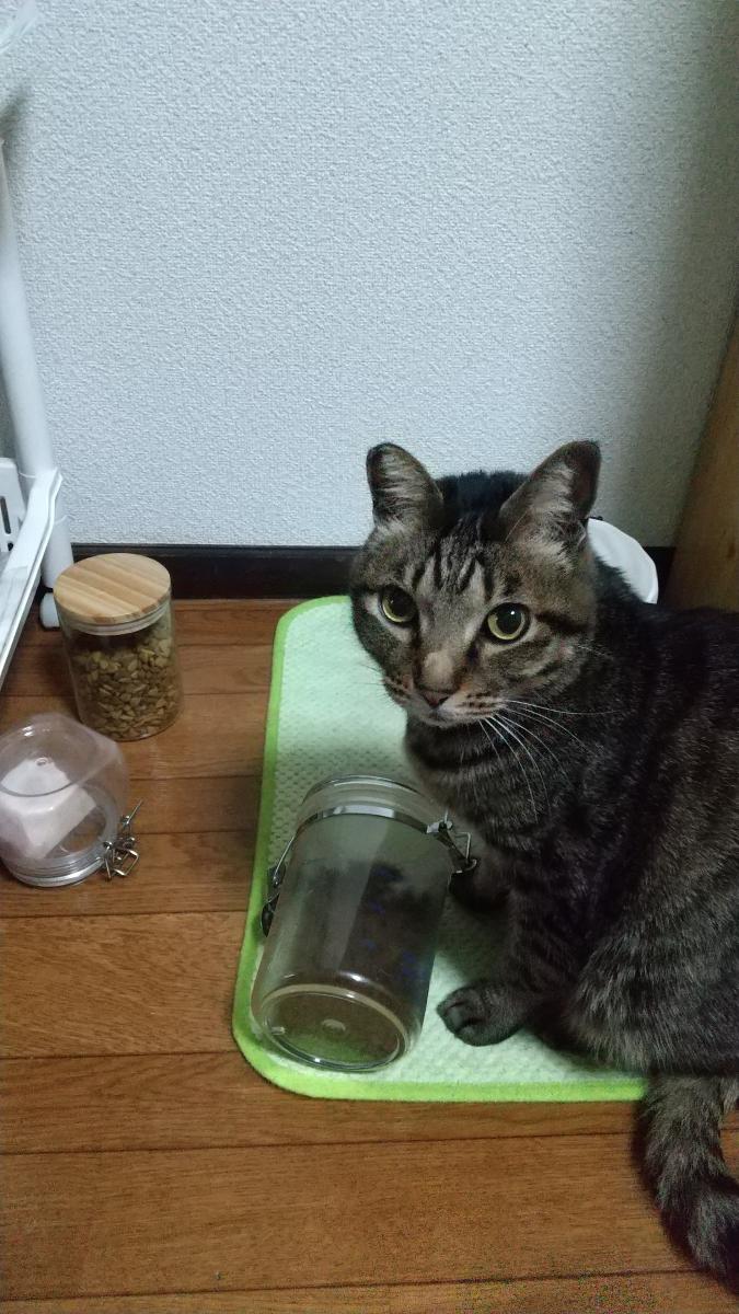 フードボトルを倒して「ちょーだい」とアピールするのですが、ガラスのボトルだけは倒しません