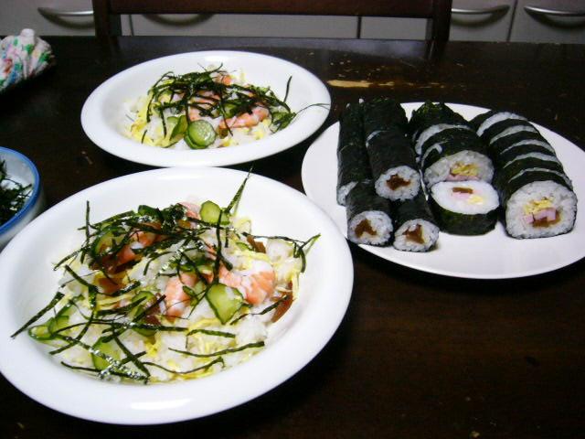 子供用太巻きの中身は魚肉ソーセージ、かんぴょう、卵の薄焼き、薄焼きは薄焼きではなくて普通に焼いたやつで甘くしてあります、あまりうすいと物足りない、ふわふわ感があるくらい。