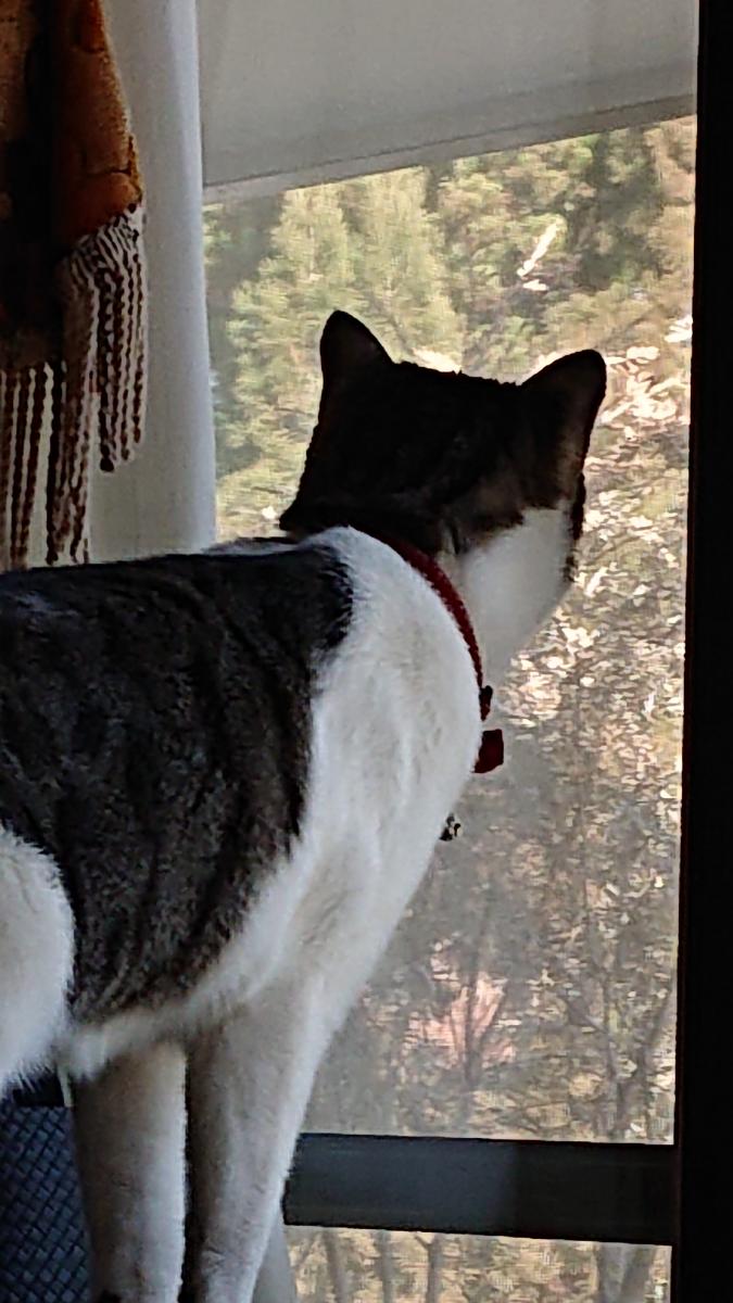 5月15日(木)曇り 今日は天気が悪くなるのだろうか。 少し前まで日がさしていたのだが。 いつものとおり、狭いサッシの隙間から外の様子をうかがうリンちゃんでした。