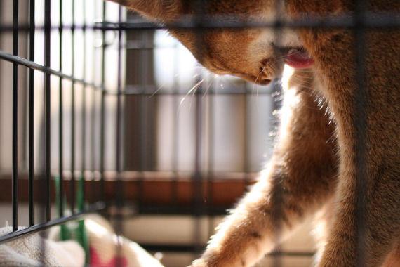 バスタオルで拭いて、簡易ゲージに移してドライヤーを当てながら