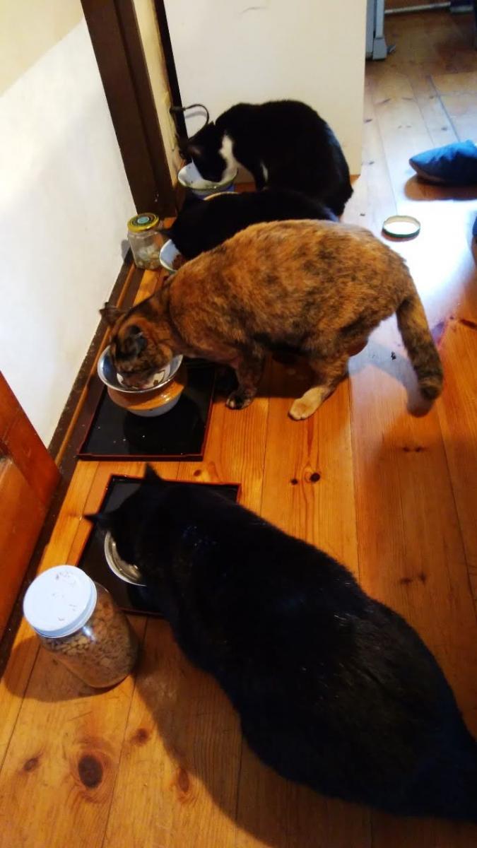 手前から、保護猫ベル、保護猫サチ、うちの子くろ、ぴよんです。