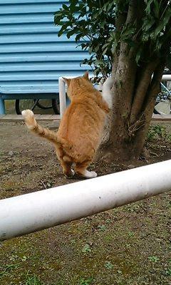 その直後、おもむろに立ち上がったトラ衛門が近くの木で爪磨ぎをしようと木の前で立ち上がりました。