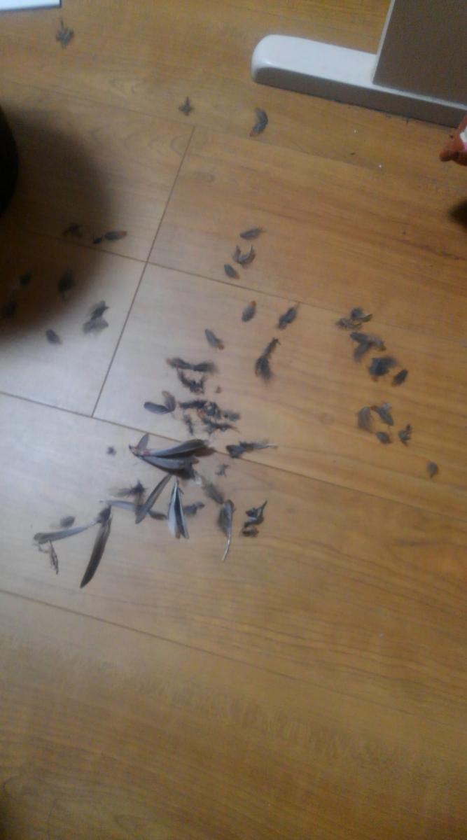 鳥の羽ってふわふわ飛ぶから、片付けるの大変なのよ・・・。