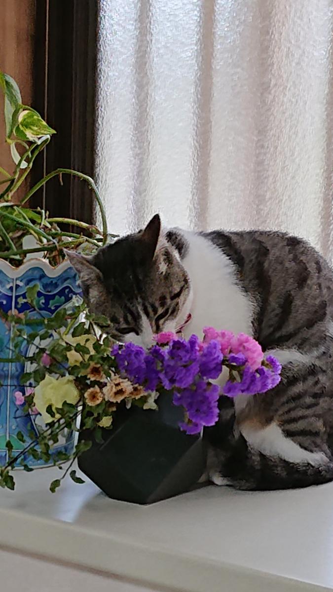 立ち入り禁止と言われているのに、さりげなく侵入している。女の子だからお花が好きなのかと見ていると、カミカミしているリンちゃんでした。