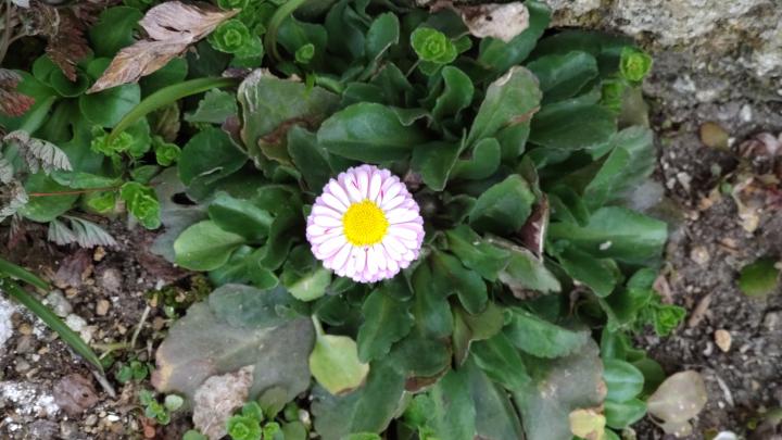 子供の頃から、ずっとひとりでに生えてきて花を咲かせています。ずっと「だんごっぱな」とうちでは呼んでいて、ヒナギクだと知ったのはわりと最近なのです。