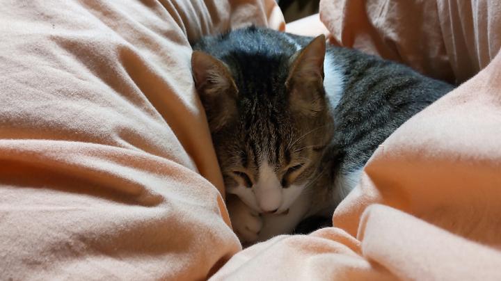 普段、私の部屋には滅多にやって来ないのに、珍しく私のお布団で寛いでいました。可愛いな。