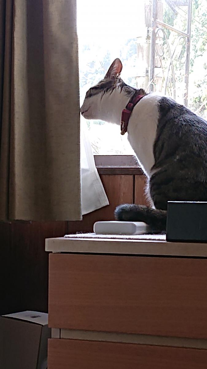 5月15日(木)曇り 今日は天気が悪くなるのだろうか。 少し前まで日がさしていたのだが。 いつものとおり、狭いサッシの隙間から外の様子をうかがうリンちゃんでした。