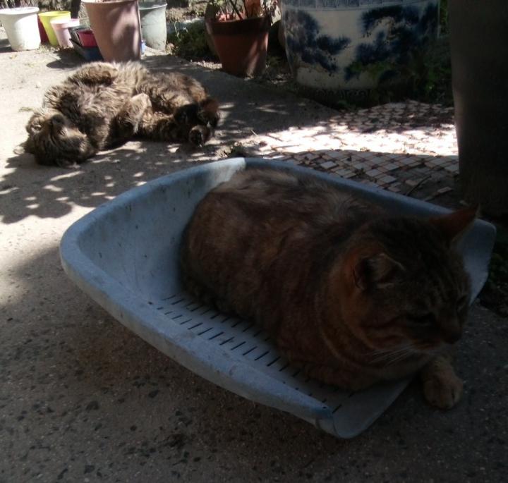 今日は日向ぼっこのアト君とトラオ 草とりしようと出したえぶの中にトラオ ゴロゴロしているのがアト君