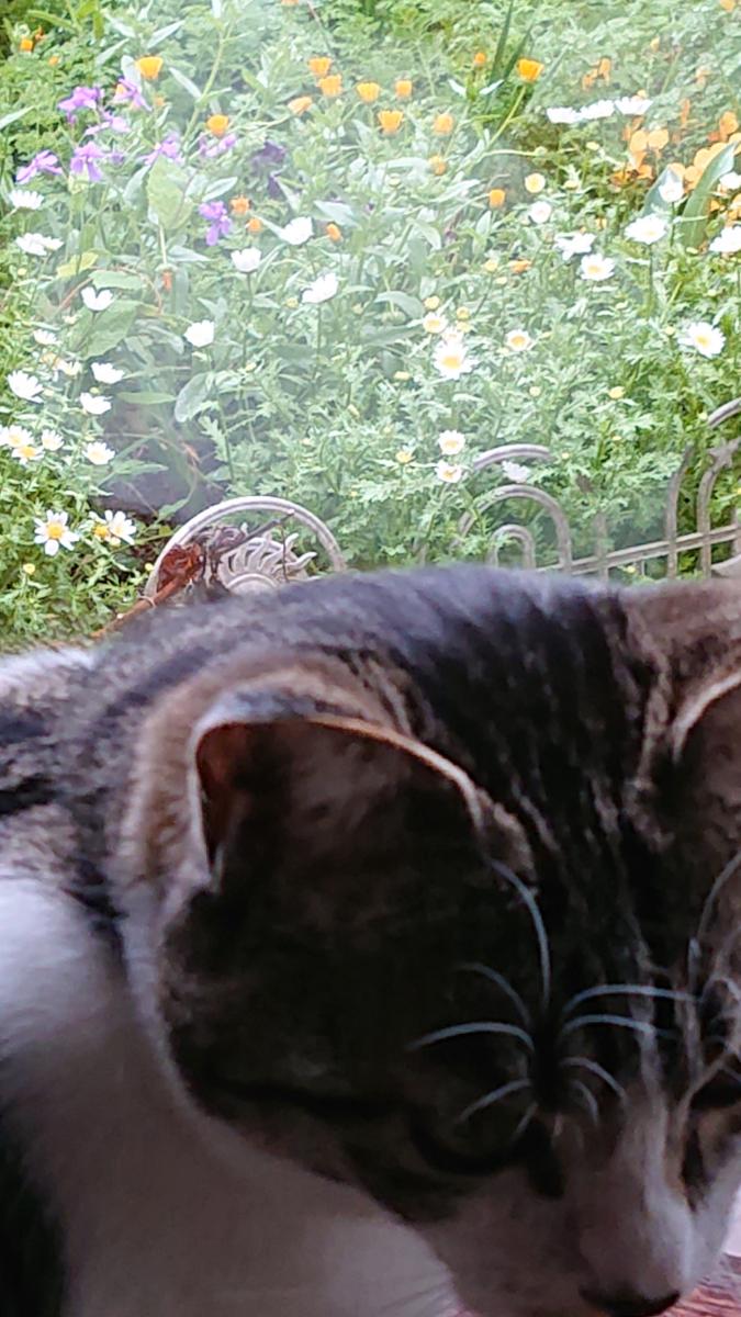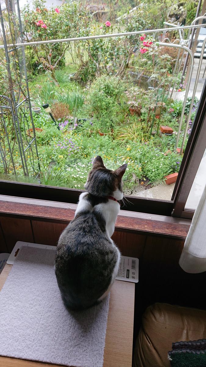 5月25日(日)晴れ 昨日は1日中土砂降りの雨だったが今日は朝からぴーかんのいい天気だ。 外で散歩をする先輩猫のクロちゃんを居間のガラス戸の隙間越しに眺めるリンちゃんでした。