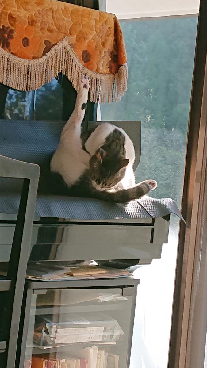 最近リンちゃんはトレーニングに余念がない。ここかと思えばまたあちら。狭い部屋を全速力で走っている。そうかと思えばピアノからカーテンレールの上まで飛び上がる。トレーニング後のストレッチシーンしか写真に収める事が出来ないミツジロウはんであった。