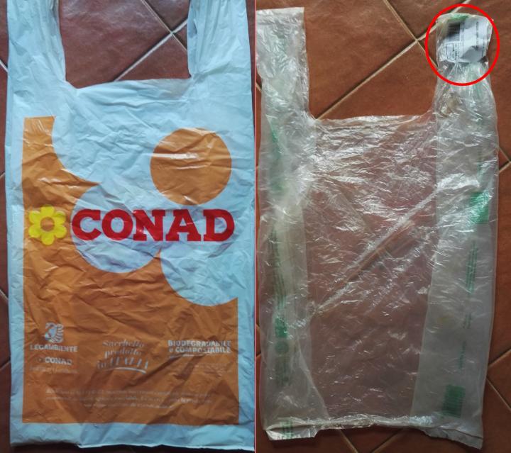 クタクタしていて、すぐに破れる生分解性(自然分解出来る)素材のレジ袋(左)と、青果物の袋