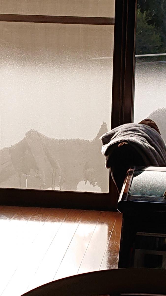 朝早くリンちゃんが起こしに来た。早くといっても7時だが。リビングに行って窓を見ると今日もお絵かきをしている。どうやら足の部分は偶然に出来たように思われる。この日記を書く頃には跡形もなく消えているアートです。