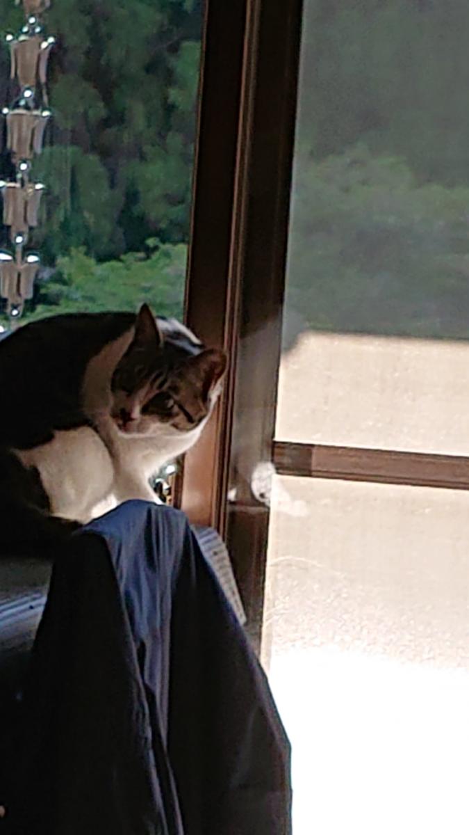 5月25日(日)晴れ 昨日は1日中土砂降りの雨だったが今日は朝からぴーかんのいい天気だ。 外で散歩をする先輩猫のクロちゃんを居間のガラス戸の隙間越しに眺めるリンちゃんでした。
