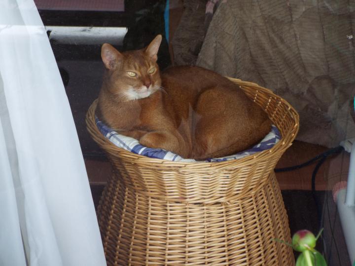 み~たんはお外を眺めるのが大好き、特に籐製の椅子の上から眺めるのが・・・・ベランダでは藤の花の甘い匂いに誘われ、数匹のミツバチが花の蜜を吸っています。み~たんはそんな飛び交うミツバチに興味津々!!夢中ですwww。今月の26日にはみ~たんは9歳に、パパは○△歳になります。