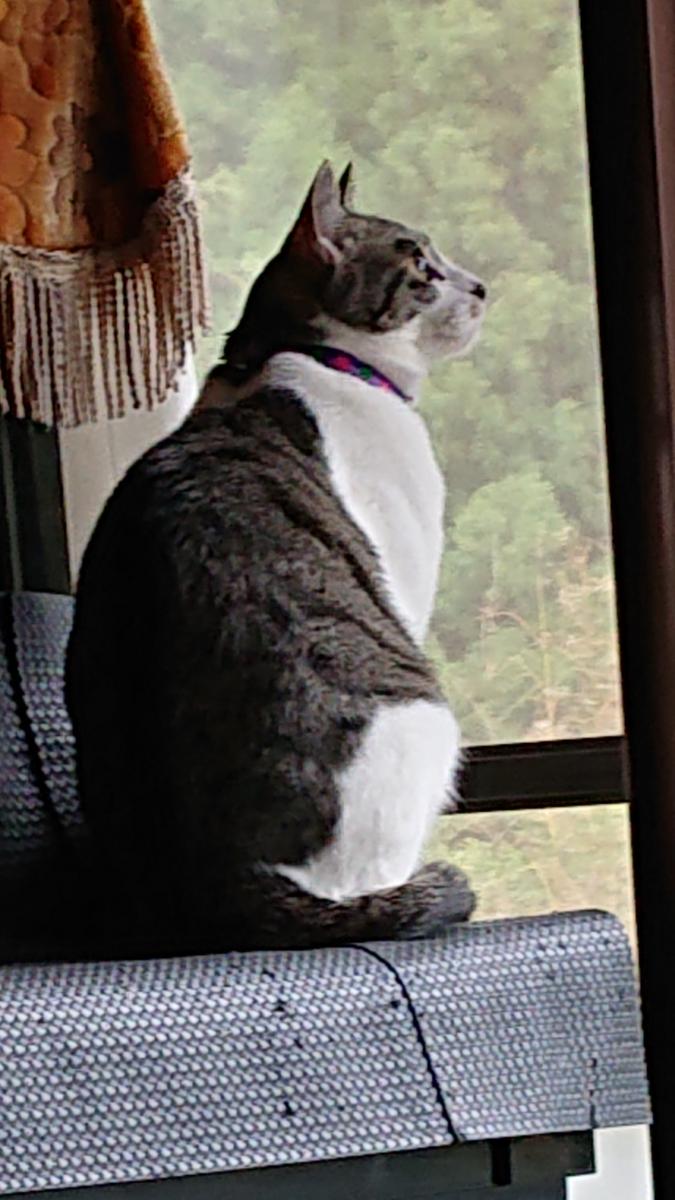 6月4日(水) 今日は朝からもがいい。 雨の日はお姉ちゃんのベッドを拝借して朝からお休みしているのだが、今日はいつものピアノの上で、前の道路を走る車を眺めるリンちゃんでした。
