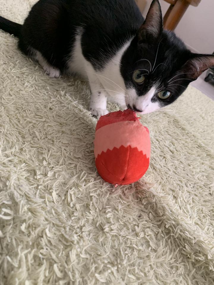 ちっちゃいぬいぐるみを獲物にするのが大好きです。ジャンプ力もすごく高いです。