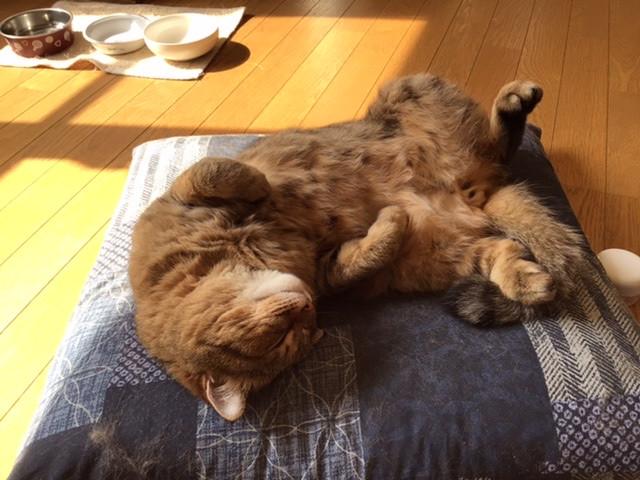 今日はご主人の布団にやってきて、「よとぎにゃ」とばかりに「ごろごろごろ」「ふみふみふみ」と一通りやって、ご主人の脇でおねんねするたぬきねこ。