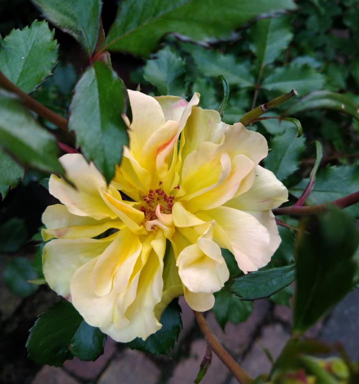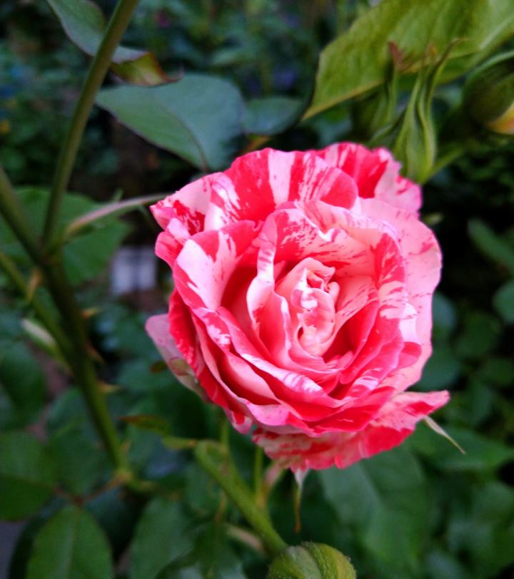 咲き始めた薔薇の花が雨に当たっちゃうなぁ。