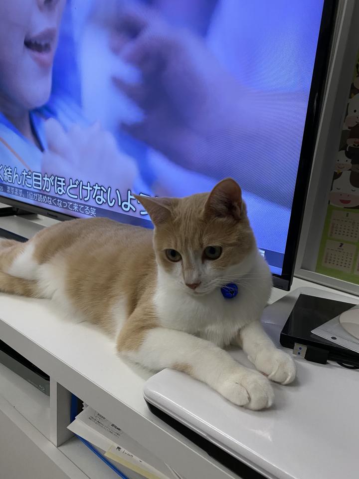 TV台に登り私が、PCを使えないように前足で押さえてる(´×ω×`)