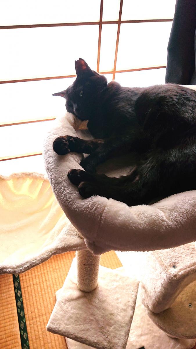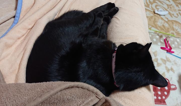 昨夜は私の右膝を枕にして寝てました。