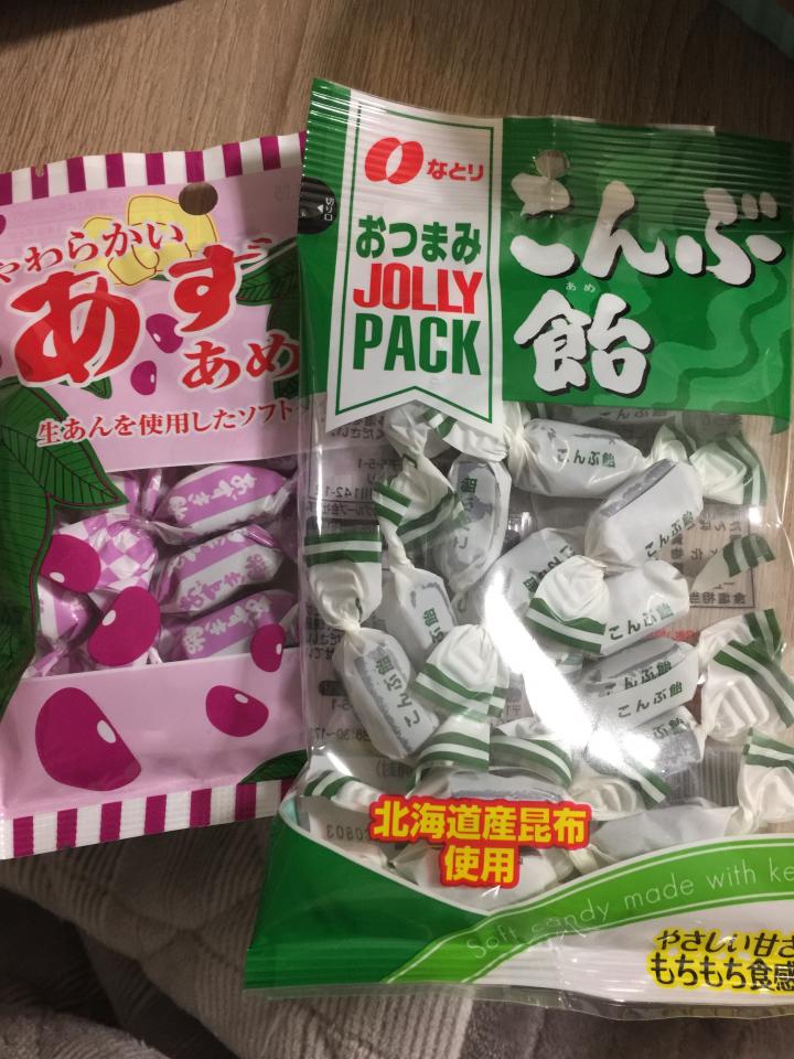 これはDAISOです。昆布飴と、初めて見たあずきの柔らかい飴‼️2つはメーカー違いました。好きなのよーオブラートに包まれた飴♬🥰
