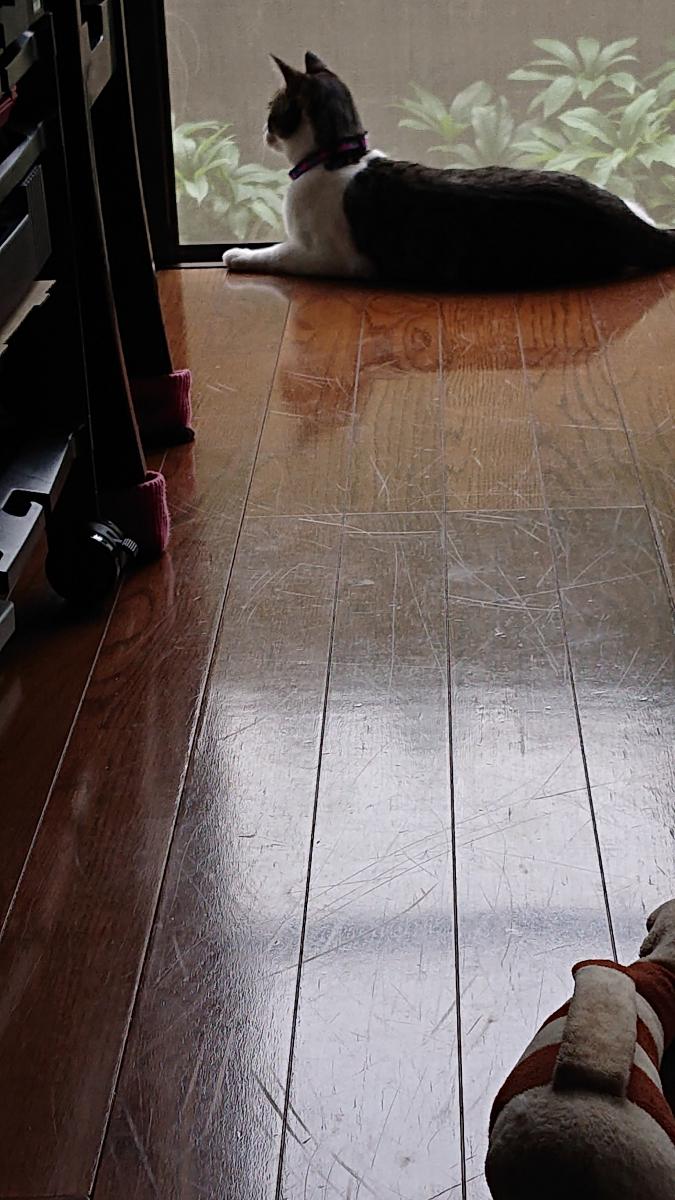 5月25日(日)晴れ 昨日は1日中土砂降りの雨だったが今日は朝からぴーかんのいい天気だ。 外で散歩をする先輩猫のクロちゃんを居間のガラス戸の隙間越しに眺めるリンちゃんでした。