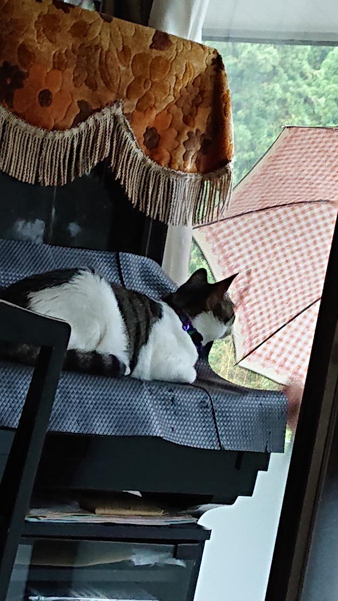 6月4日(水) 今日は朝からもがいい。 雨の日はお姉ちゃんのベッドを拝借して朝からお休みしているのだが、今日はいつものピアノの上で、前の道路を走る車を眺めるリンちゃんでした。