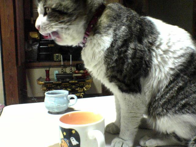 夜中帰ってきて、飲み残しの牛乳を飲んでホッとしているのかにゃぁ~。