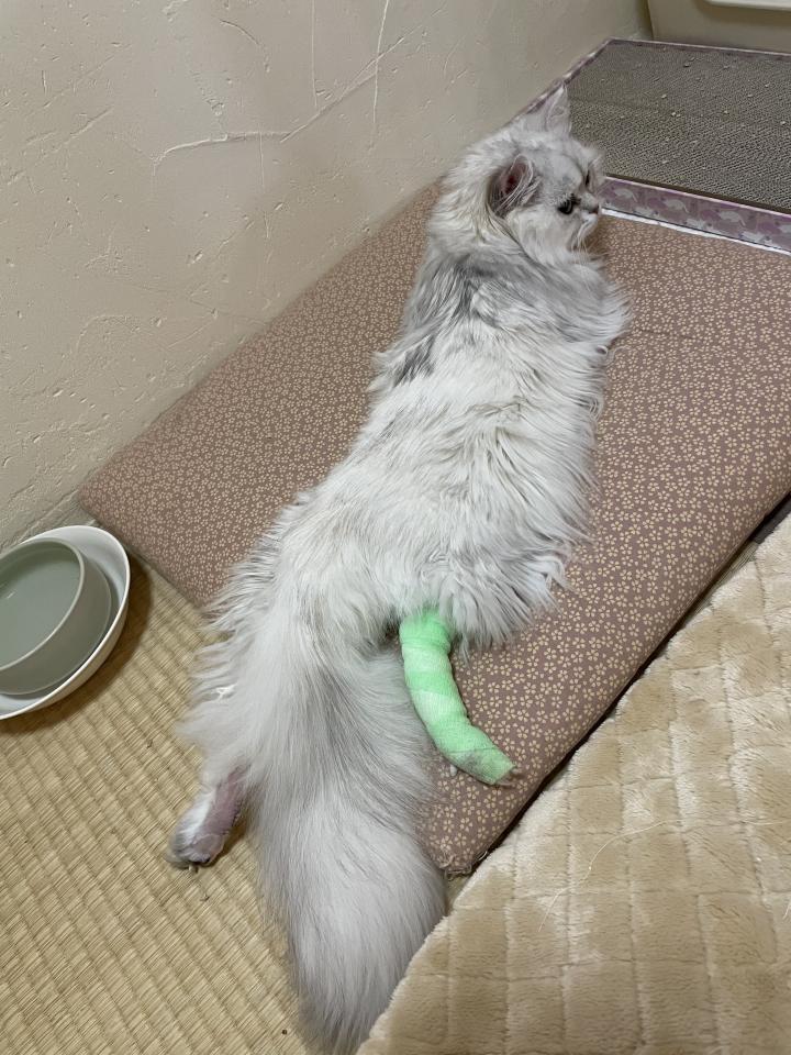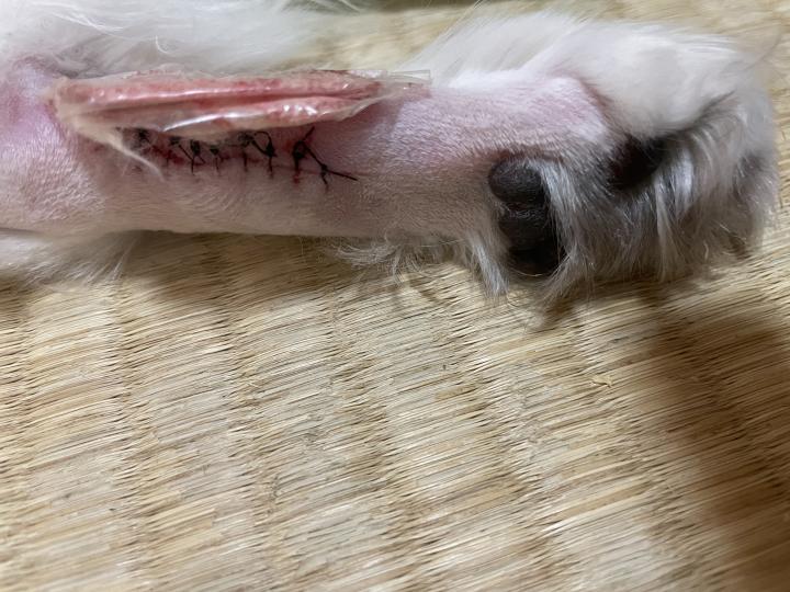 先生「右脚の方は念のため(傷口舐めないため)包帯をグルグル巻いておけたんですけど、左脚は途中で麻酔から目が覚めて「痛い!」ってなってテープだけになってます。」