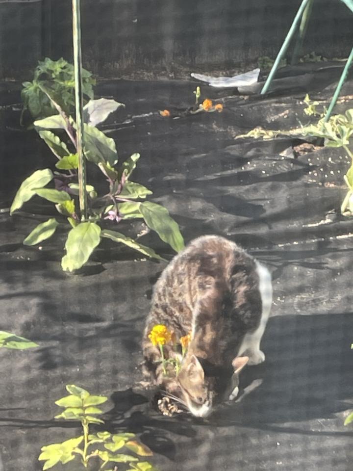 んん! さっきのコが庭の野菜苗の間で寛いでいるではないか!