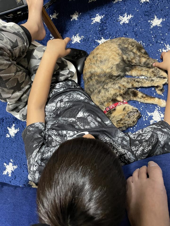 骨折中の息子に寄り添いゴロゴロと癒しを与えてくれています。笑