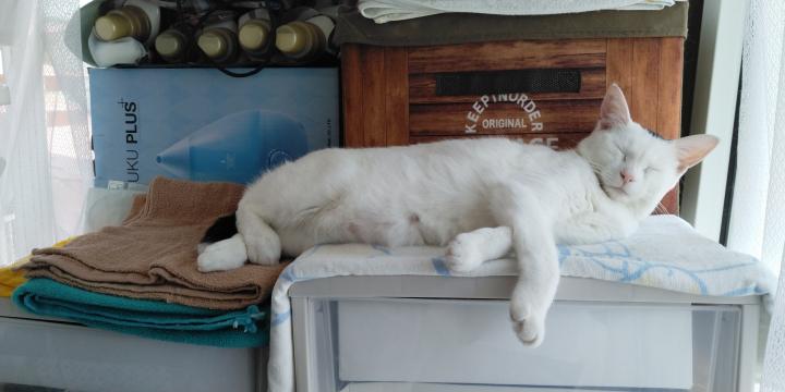 気温が上がると、涼しくて風がほどよく感じられる場所へ移動をしてお昼寝をするしらつゆ。