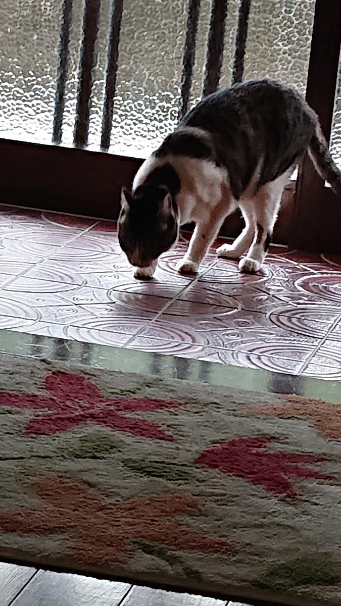 5月25日(日)晴れ 昨日は1日中土砂降りの雨だったが今日は朝からぴーかんのいい天気だ。 外で散歩をする先輩猫のクロちゃんを居間のガラス戸の隙間越しに眺めるリンちゃんでした。