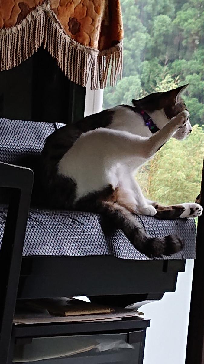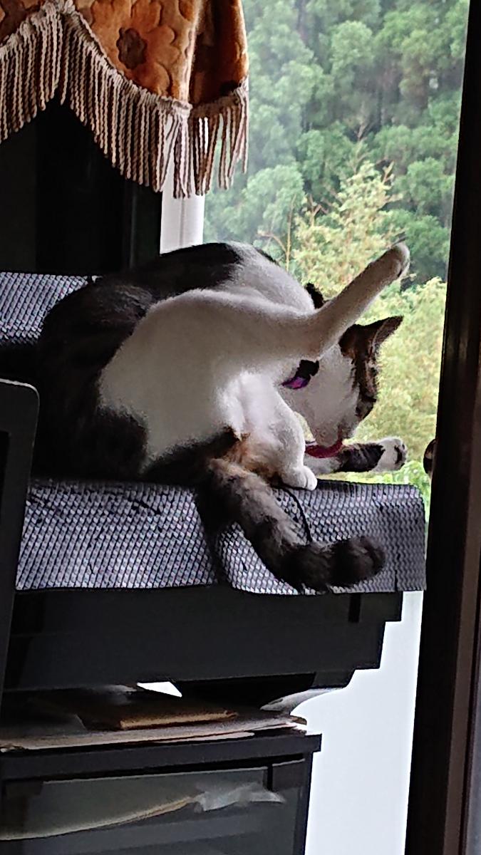 6月4日(水) 今日は朝からもがいい。 雨の日はお姉ちゃんのベッドを拝借して朝からお休みしているのだが、今日はいつものピアノの上で、前の道路を走る車を眺めるリンちゃんでした。