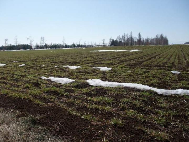 先月融雪剤をまいた小麦畑も、こんなに地面が見えてます。