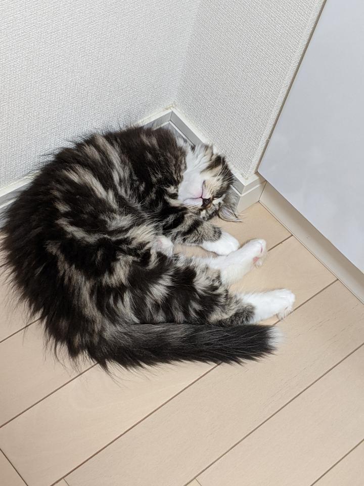 猫ベッドもケージもソファも座布団もあるのに、寝室の床で寝るのなぜ…… 布は暑いのかな
