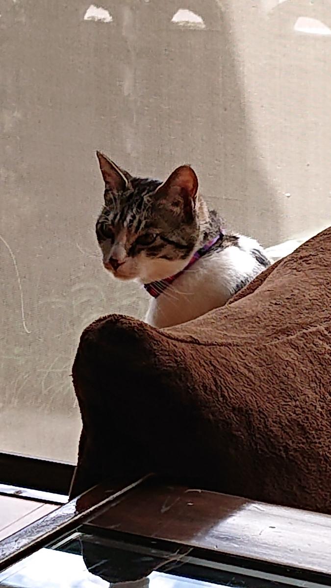 5月25日(日)晴れ 昨日は1日中土砂降りの雨だったが今日は朝からぴーかんのいい天気だ。 外で散歩をする先輩猫のクロちゃんを居間のガラス戸の隙間越しに眺めるリンちゃんでした。