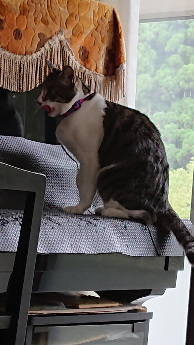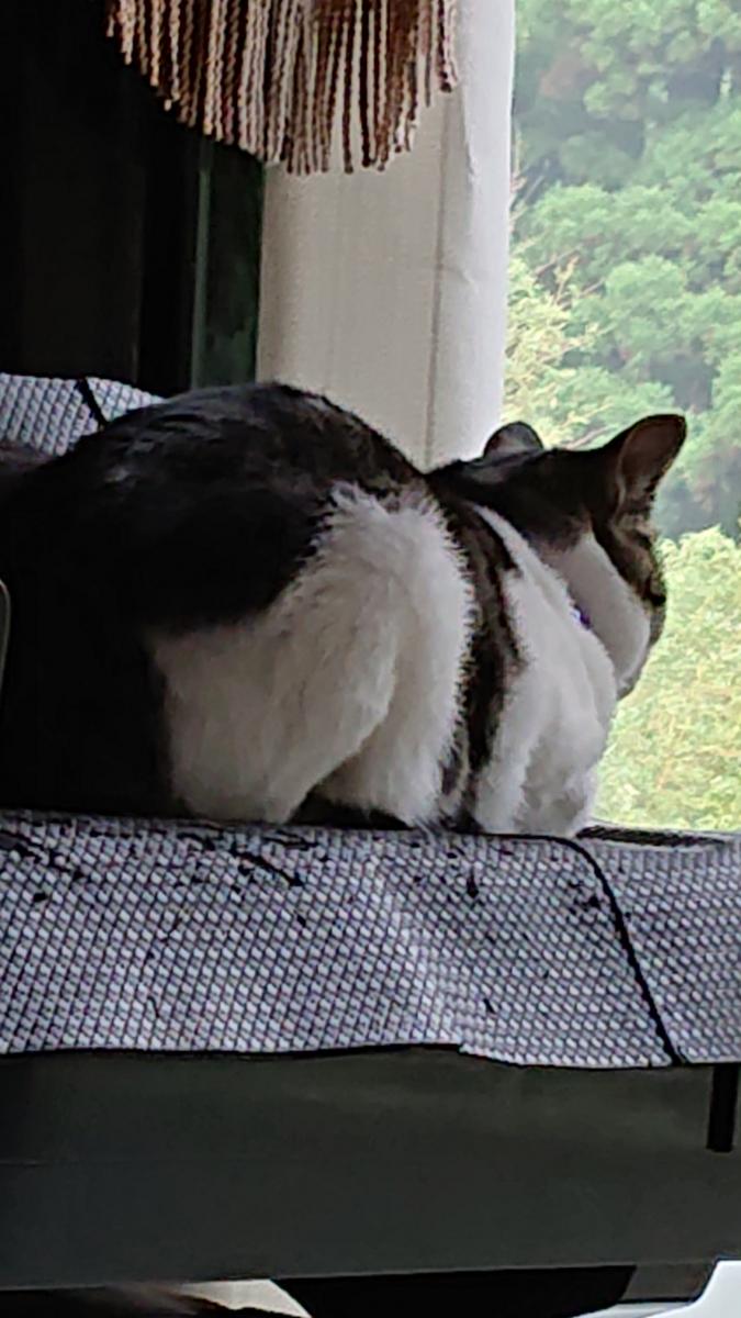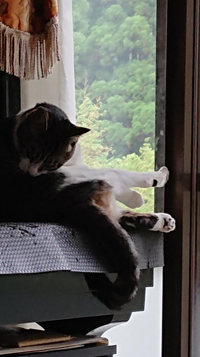 6月4日(水) 今日は朝からもがいい。 雨の日はお姉ちゃんのベッドを拝借して朝からお休みしているのだが、今日はいつものピアノの上で、前の道路を走る車を眺めるリンちゃんでした。