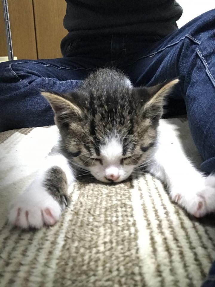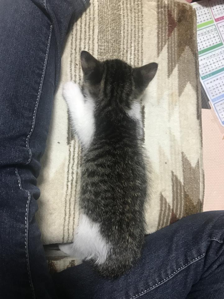 ぐで〜と伸びるは、やっぱりママの近く。後ろ足はクッションの隙間にパックンちょ!